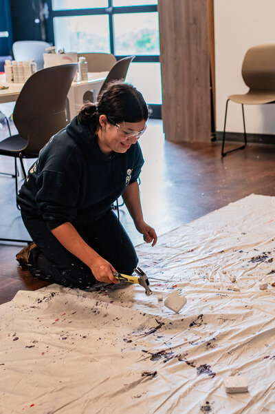 and because I’ve always loved creative outlets. I didn’t know what to expect and felt awkward at first, but once I picked up the hammer and smashed that first block, something opened up. The note inside hit me hard and brought out emotions I didn’t realize I was holding. Afterward, I felt more relaxed, more at peace. I didn’t feel any judgment, except from myself, and the process reminded me how important creative spaces like this are. I learned that I need more of them, more ways to let things go through art. The space felt grounded and soft, and Raelynn guided just enough while letting us find our own way.